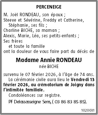 C’est avec une grande tristesse que nous vous annonçons le décès d’Annie RONDEAU survenu le samedi 07 février 2026 à Vertilly. La cérémonie se déroulera dans l'intimité familiale.