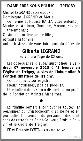 C’est avec une grande tristesse que nous vous annonçons le décès de Gilberte LEGRAND survenu le samedi 01 novembre 2025 à Treigny. La cérémonie se déroulera le vendredi 07 novembre 2025 à 15h00 à l’adresse suivante : Eglise Treigny - 89520 Treigny.