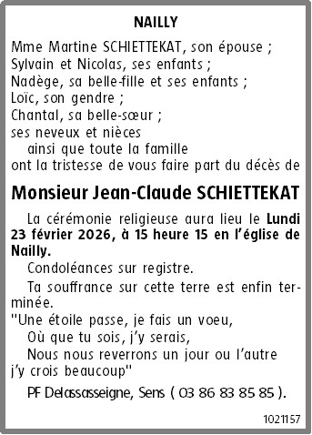 C’est avec une grande tristesse que nous vous annonçons le décès de Jean-Claude SCHIETTEKAT survenu le dimanche 15 février 2026 à Nailly. La cérémonie se déroulera le lundi 23 février 2026 à 15h15 à l’adresse suivante : Église Saint Urbain - 89100 Nailly.
