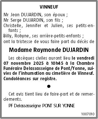 C’est avec une grande tristesse que nous vous annonçons le décès de Raymonde DUJARDIN survenu le vendredi 31 octobre 2025 à Sens. La cérémonie se déroulera le vendredi 07 novembre 2025 à 10h45 à l’adresse suivante : Chambre Funéraire Delassasseigne - Route de Paris - 89140 Pont-sur-Yonne.