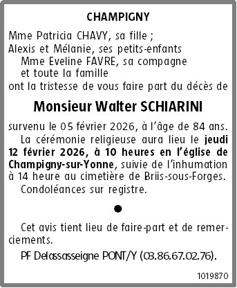 C’est avec une grande tristesse que nous vous annonçons le décès de Walter SCHIARINI survenu le jeudi 05 février 2026 à Champigny. La cérémonie se déroulera le jeudi 12 février 2026 à 10h00 à l’adresse suivante : Église Saint Martin - 6 Place de l'Église - 89340 Champigny.